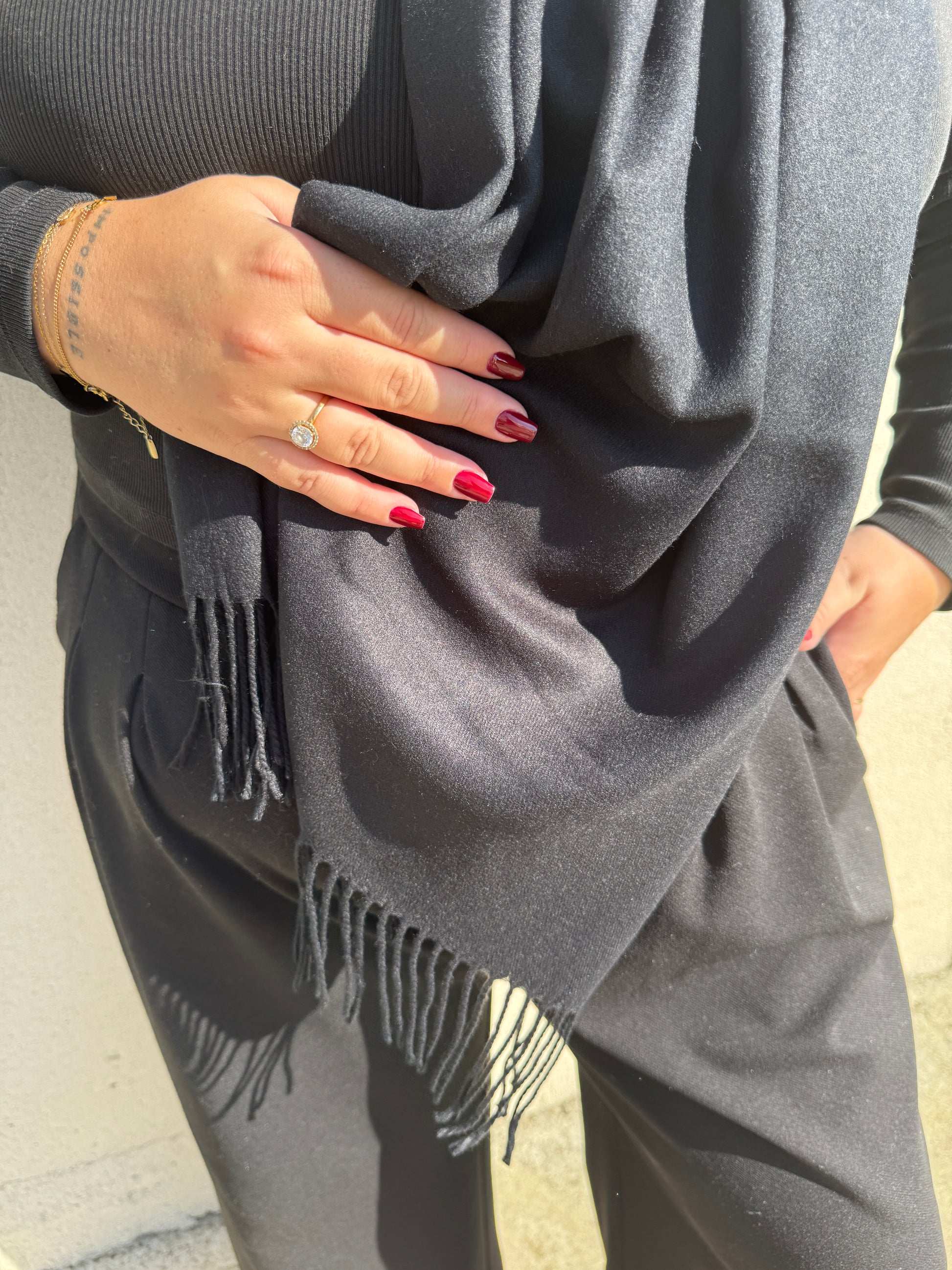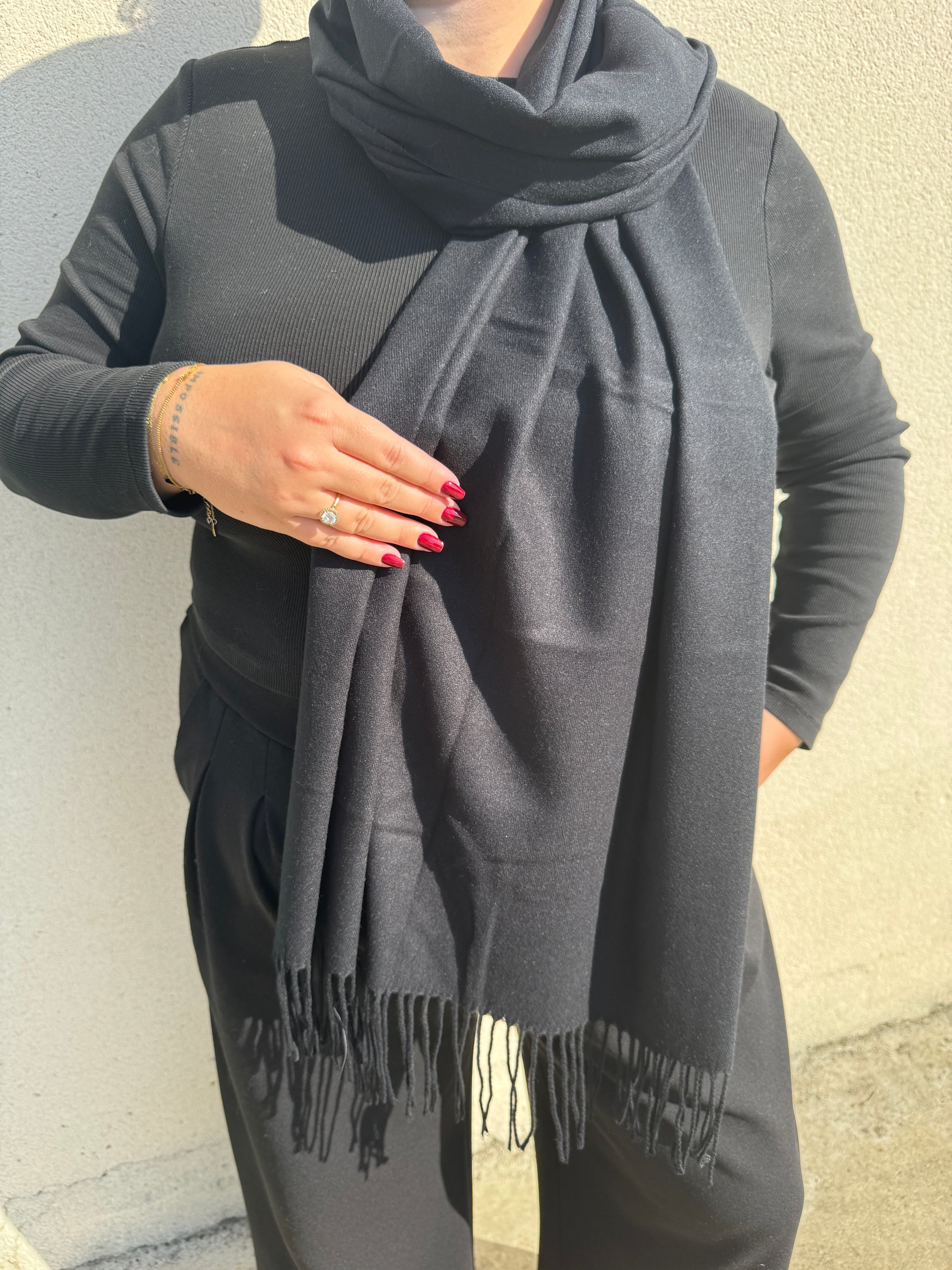 - Écharpe cachemire uni avec franges, noire.