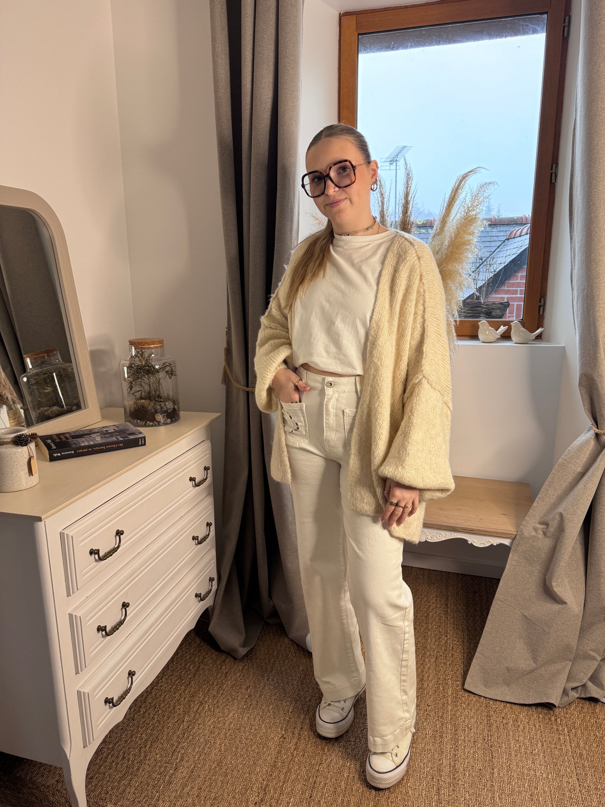Ce jean bootcut blanc, existe en plusieurs tailles.