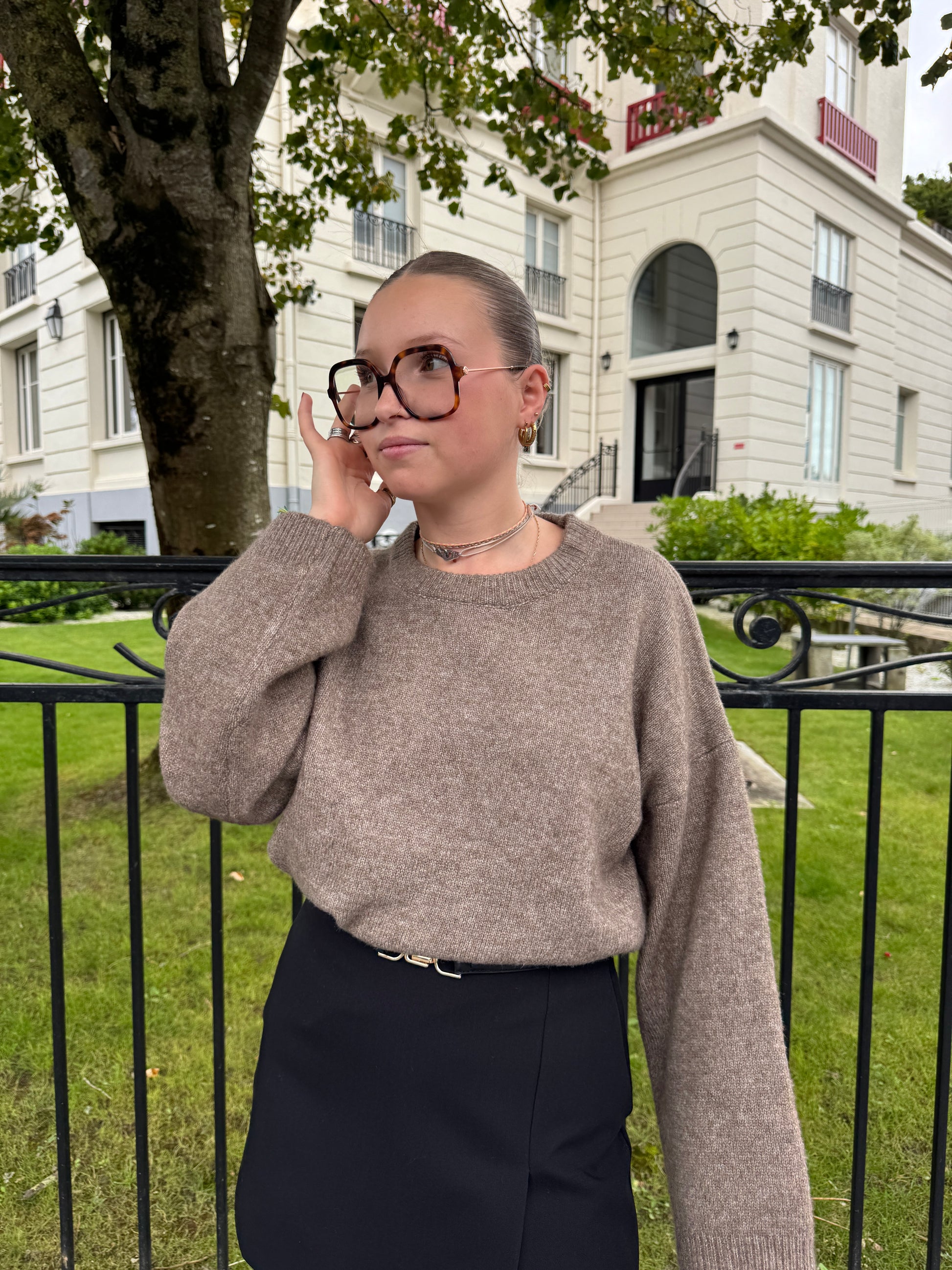 - Pull marron clair, à manches évasées.